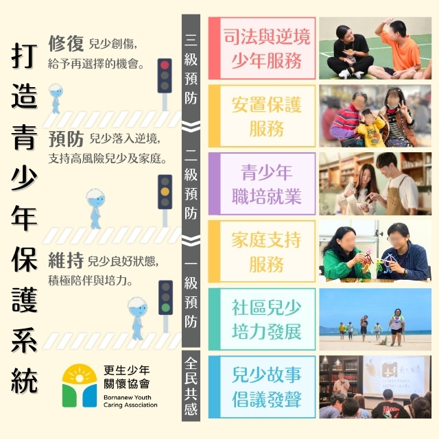透過六大服務,建構「青少年支持保護系統」,幫助兒少與其家庭修復創傷,預防落入逆境,並維持其良好狀態!