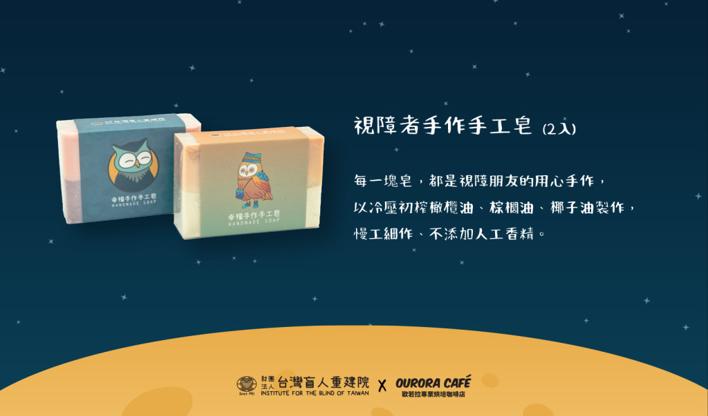 每一塊皂,都是視障朋友的用心手作,以冷壓初榨橄欖油、棕櫚油、椰子油製作慢工細作、無添加人工香精(僅添加純天然礦泥、天然草本植物粉、天然花粉)。