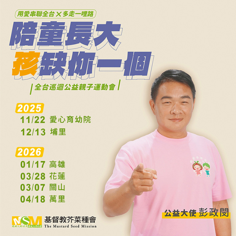 為了讓脆弱家庭的孩子安心成長、家庭逐步邁向自立,基督教芥菜種會舉辦「用愛串聯全台×多走一哩路,活動號召企業、捐款人與民眾,以健行、單車、登山等行動串聯全台,一起陪伴兒少「多走一哩路」。活動邀請知名球星恰恰彭政閔擔任公益大使,芥菜種會長年串聯社會的愛與支持,2026年五大服務方針也藉由參與活動正式啟動,一同傳遞對孩子與家庭的陪伴與支持,實踐兒少安心生活、穩定照顧與學習陪伴。