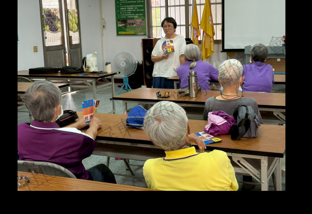 長得像骰子平面圖,動動腦動動手,嘗試摺出指定詞彙圖案,例如:「居家護理」、「延緩老化」、「預防失智」、「防跌運動」等等四個字的詞