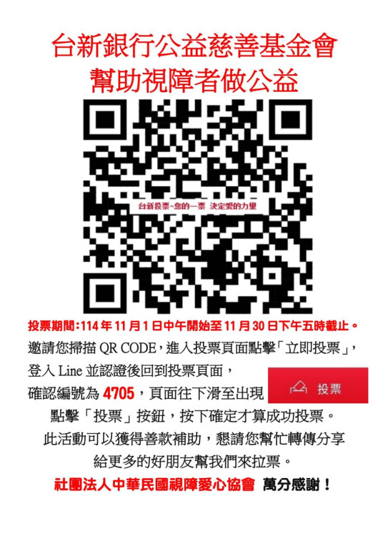 麻煩您幫我們點提案號碼4705號社團法人中華民國視障愛心協會,參加台新銀行的票選活動,這樣有獎金可以幫助協會做更多的事情,希望發揮您的愛心,感謝您!
