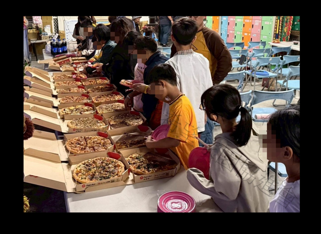 老師、志工、學童們一起用餐,一定要吃披薩的,是小朋友的最愛
