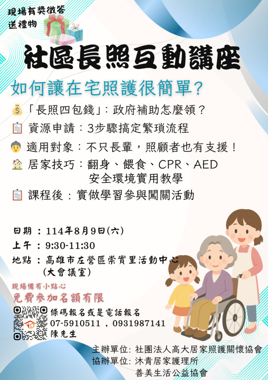114 年 8 月 9 日——社團法人高雄市高大居家照護關懷協會,聯合善美生活公益協會與沐青居家護理所,於高雄市左營區崇實自助里活動中心舉辦「在地照顧・安心守護」照護公益活動。活動以推廣長照 2.0 政策、提升社區民眾居家照護知識與技能為核心,融合政策宣導、技能教學與實作體驗,吸引眾多居民、照顧者與志工參與,充分展現社區整合照護的成果。