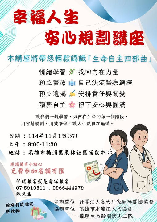 本次活動由社團法人高雄市高大居家照護關懷協會主辦,高雄市水流庄人文協會及龍明生長齡關懷志工隊協辦,感謝東林社區發展協會協力場地支援,共同推動在地長照與生命教育。未來協會將持續於各社區辦理健康與生命規劃講座,期望讓更多市民能「在地老化、安心生活」。