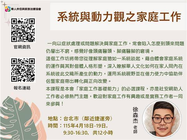 這個工作坊將帶您從理解家庭猶如一系統談起,藉由體會家庭系統的運作與其對個體人格形塑,深入瞭解華人文化如何在家人間內在系統彼此交織所產生的動力,運用系統視野並在借力使力中協助伴侶暨家庭帶出轉化與正向改變。