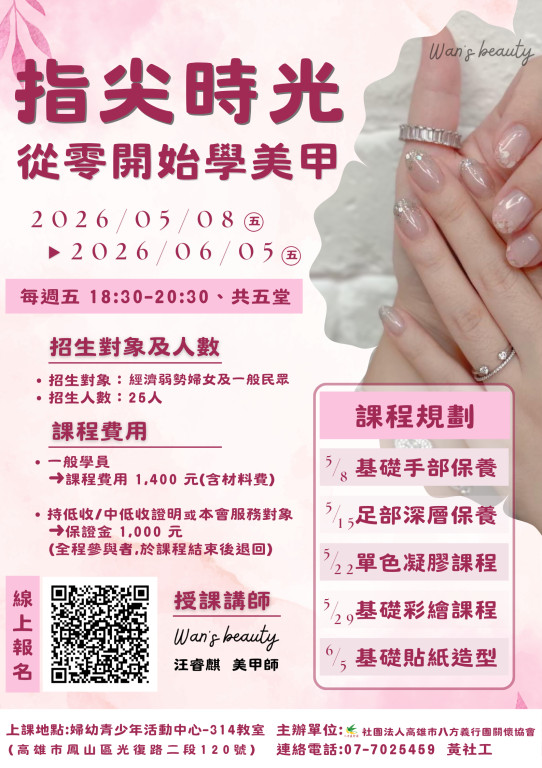 名額有限,歡迎有興趣的朋友把握週五下班後的時間,一起從零開始學美甲,在忙碌生活中為自己保留一段變美與成長的時間,讓指尖綻放自信與美麗