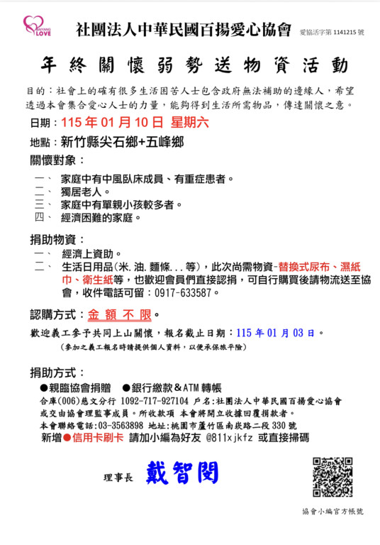 二、 生活日用品(米.油.麵條...等),此次尚需物資-替換式尿布、濕紙巾、衛生紙等,也歡迎會員們直接認捐,可自行購買後請物流送至協會,收件電話可留:0917-633587。