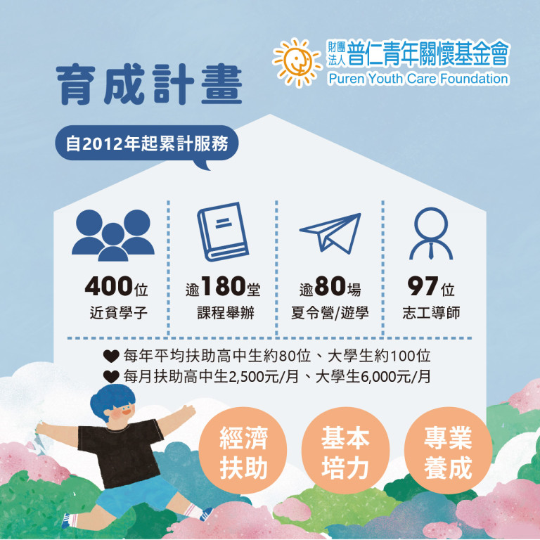 3.一對一陪伴:每位孩子將安排一位「志工導師」關懷陪伴,每月至少關懷一次,提供孩子生活智慧、心情傾訴、職涯經歷等各方面的經驗分享