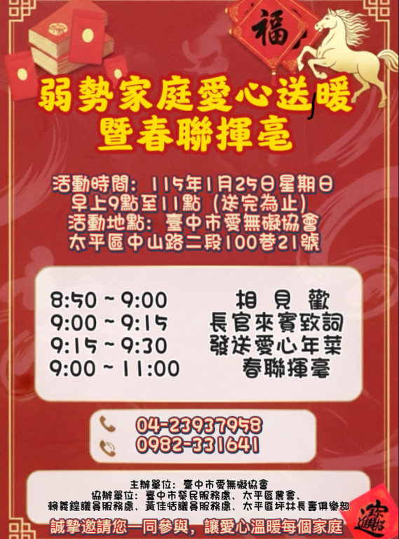 臺中市愛無礙協會誠摯邀請您一同共襄盛舉,用行動傳遞新春溫暖!活動當天將發送愛心物資與年菜,關懷弱勢家庭過個安心、溫暖的好年,現場並安排春聯揮毫,讓民眾把滿滿的年味與祝福帶回家。物資與年菜數量有限,送完為止,敬請提早到場。