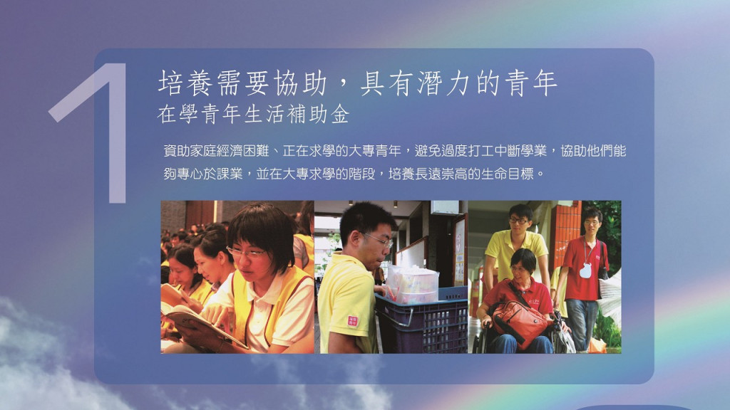 本項計劃每年共計捐助180-240萬元提供全台大專院校學生申請,使其免除生活上的憂慮,順利完成高等教育。希望透由資助在學青年生活補助金培養學生寬大的胸襟與志向,為社會造就優秀人才,並期許受扶助的學生能夠發揮所學,進而回饋社會、國家及世界,期望這份善的漣漪不斷擴大,讓世界更美好。