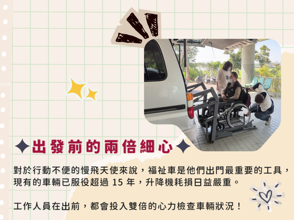 對需要輪椅輔助的慢飛天使而言,福祉車更是不可或缺的交通工具,透過車輛的升降設備與固定裝置,慢飛天使才能安全地上下車,在工作人員的陪伴下外出就醫、參與活動,甚至只是看看不同的風景。