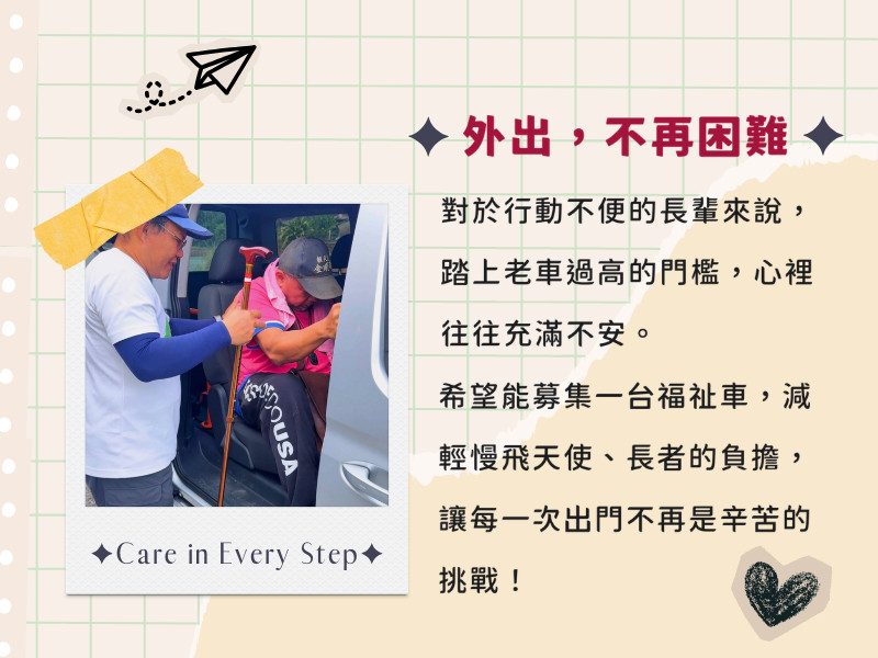 誠摯邀請您一起支持「行無礙.圓夢再出發計畫」,讓慢飛天使與偏鄉長者的每一次出門,都能更加安全、安心。